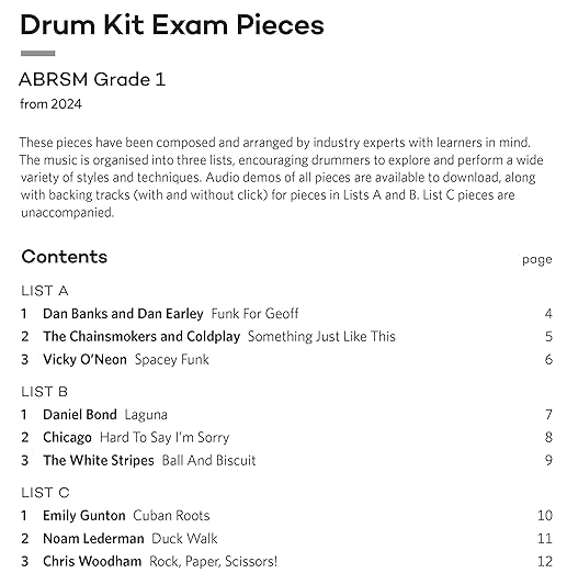This book contains nine pieces for ABRSM’s Grade 1 Drum Kit syllabus from 2024, providing drummers with everything they need to take ABRSM’s Performance Grade exam. The music spans a wide range of styles and includes an inspirational mix of new and existing tracks, as well as original pieces for solo drum kit. An ideal collection for exam candidates as well as any drummer seeking sensational new music suited to their technical ability. -Includes audio recordings for all nine tracks -Features ‘Ball And Biscuit’ (The White Stripes), ‘Hard To Say I’m Sorry’ (Chicago) and ‘Something Just Like This’ (The Chainsmokers and Coldplay) -Spans a range of styles including pop, funk, rock and hip-hop